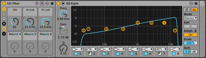 simple Ableton tilt filter. great for situations where you think "this sound needs to be brighter or darker" as opposed to trying to address a specific frequency.